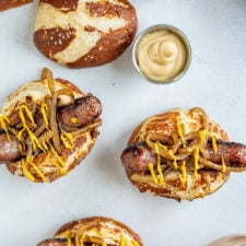 Bratwurst and pretzel rolls are the perfect pairing and LOVE to be slathered in yellow or dijon mustard. Pair this recipe with a crisp and refreshing Festbier and you’ll understand why I’m so obsessed!