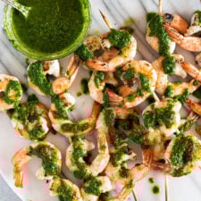 Grilled shrimp with chimichurri is a really simple and delicious summer-inspired appetizer everyone will get behind. For this recipe, we’ll skewer and grill up some large shrimp and drizzle with fresh homemade chimichurri sauce. It’s that easy.