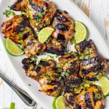 - Grill the chicken for 5-7 minutes per side or until the internal temp reaches 165°F. Serve immediately garnished with chopped cilantro and with lime wedges.
