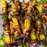 My biggest tip is to try to cut all skewered items in as uniform sizes as possible. Have your onions, peppers, chicken, and pineapple all be roughly cut into 1-inch chunks. This ensures the skewers cook evenly and lie flat on the grilling surface. For example, if the chicken is cut smaller than the veggies, they will hang above the grates and may take longer to cook and risk burning the veggies, etc.