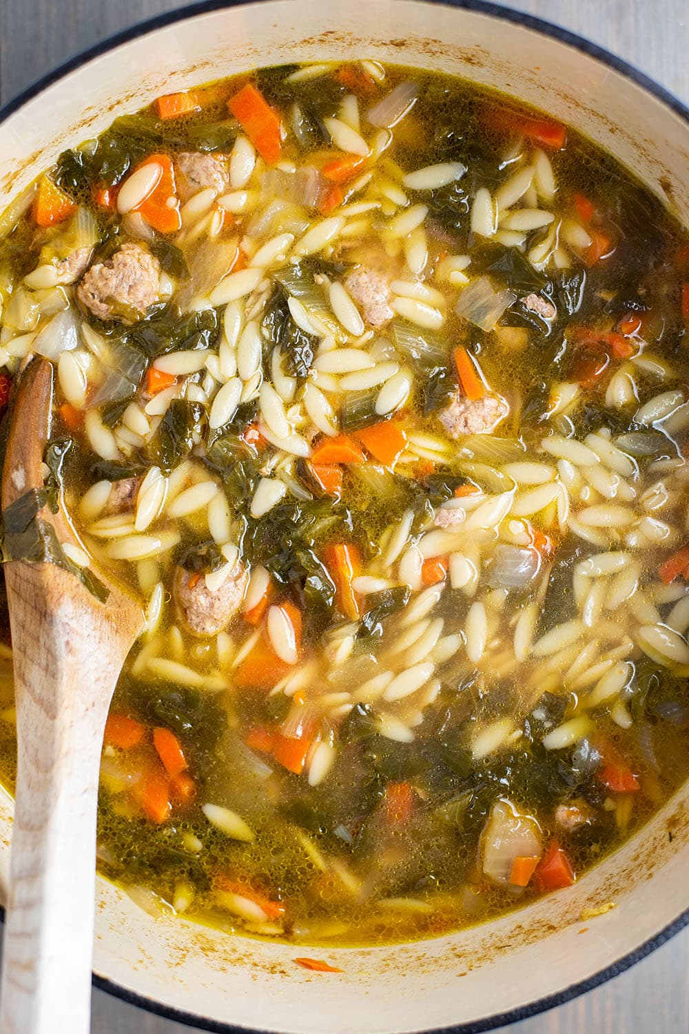 - Mix in escarole, orzo, and the meatballs. Continue to gently boil for about 10 minutes, until the orzo is cooked through. Turn down the heat to low and let simmer for another 15 minutes.