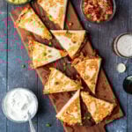My pulled pork quesadillas are made with layers of roasted peppers and red onions, Monterey jack cheese, seasoned pulled pork, and green onions. They’re cheesy, creamy, and a little smokey thanks to the pork seasoning and seared veggies. All you need are a few sides of sour cream, chunky salsa, and homemade guacamole for a delicious meal or sharable app.