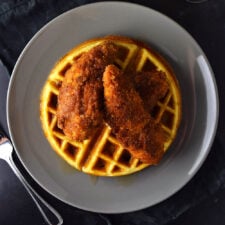 To cut down on the stress of managing waffles and fried chicken simultaneously, you can keep the tenders warm in the oven at around 200° F (after they have drained), while you make the waffles. Throw them on a baking sheet to….chill in the oven.