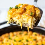 This cheesy tater tot breakfast casserole is a really easy, one-skillet recipe made with ground breakfast sausage, tater tots, eggs, milk, and cheddar cheese. It’s got all the elements of a hearty breakfast in every bite and comes together in about 10 minutes with 45 minutes of baking.