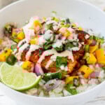 Add rice to serving bowls and add lime zest. Top with cod and a serving a mango salsa. Finish with creamy lime sauce.